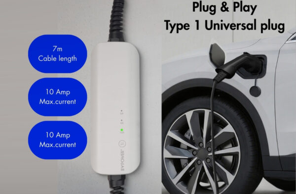 - Vehicle connector: Type 1 (SAE J1772).